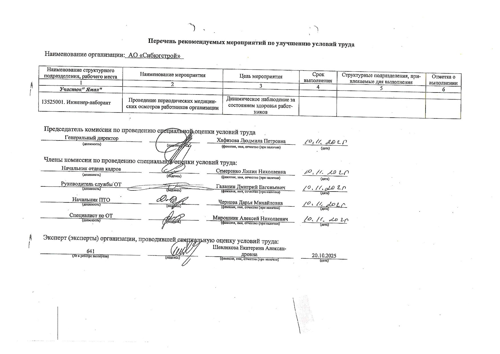 Перечень рабочих мест, на которых проводилась специальная оценка условий труда от от 10 ноября 2025